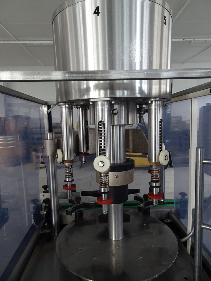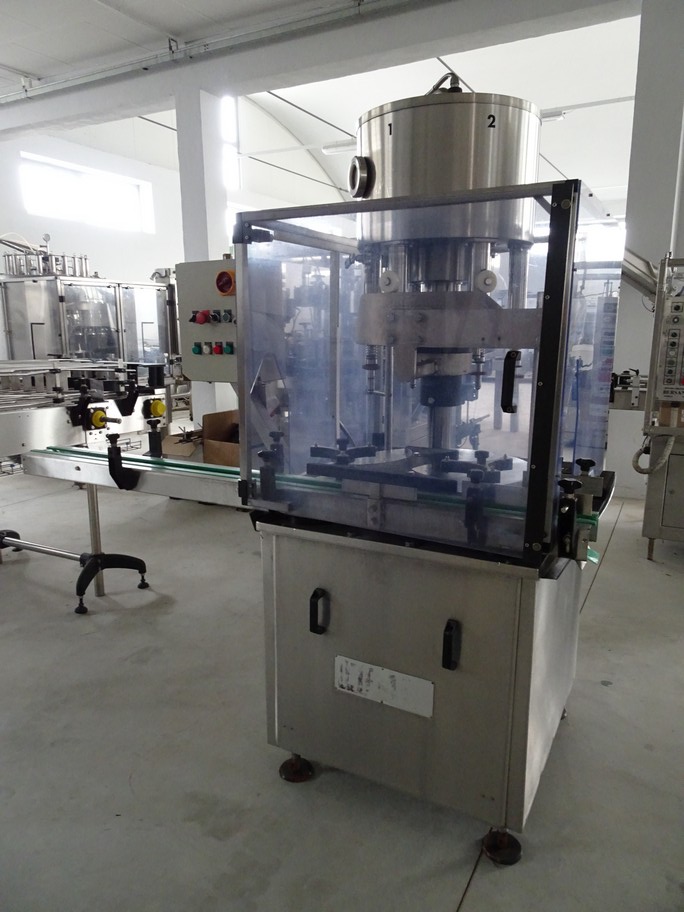 Automatic Capping Machine for 5 later dame, to work with aluminium screw cap ø35X18, with vibrating feeder, cap channel with head for on-the-fly taking the capsules. Stainless steel basement.